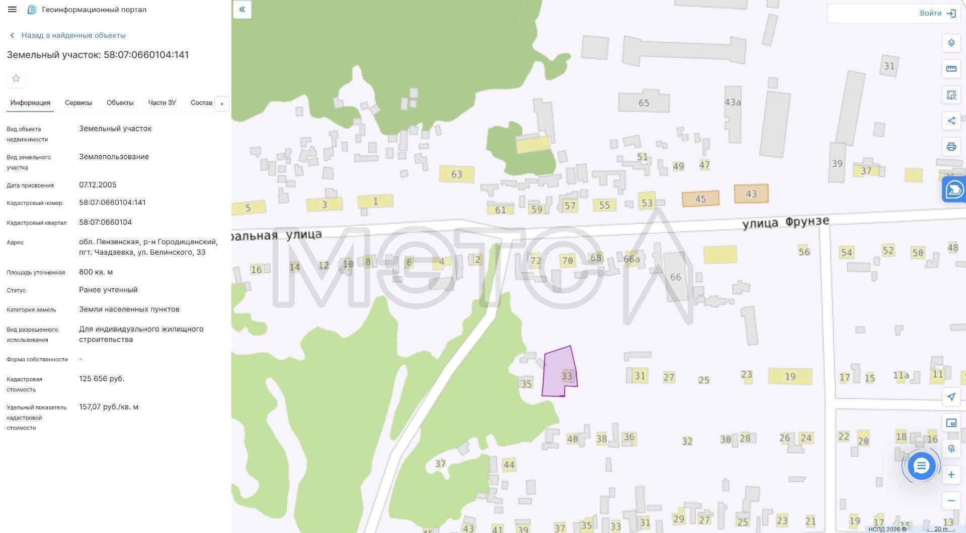 1/4 доля в праве собственности на земельный участок 8 сот. (ИЖС) и жилой дом 46.5 кв.м, Пензенская обл., р-н Городищенский, пгт. Чаадаевка, ул. Белинского, 33