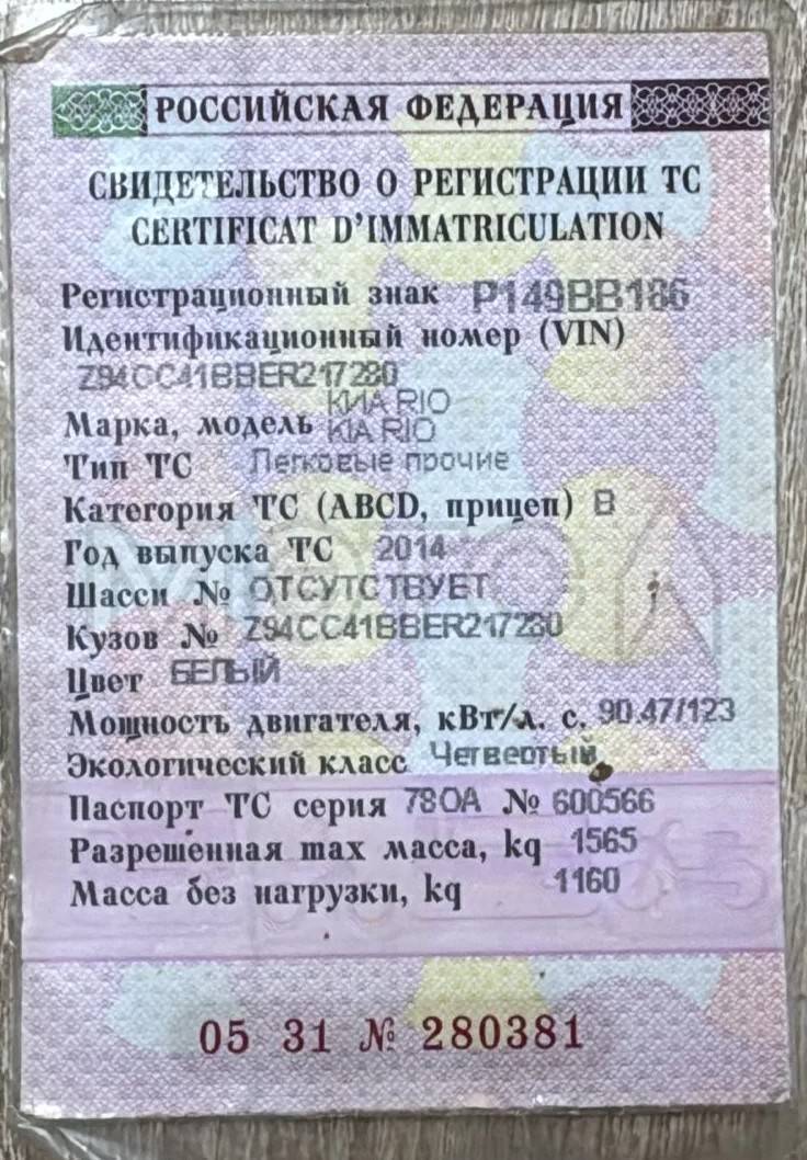 Kia Rio, 2014 г.в., VIN Z94CC41BBER217280, залог АО ТБанк