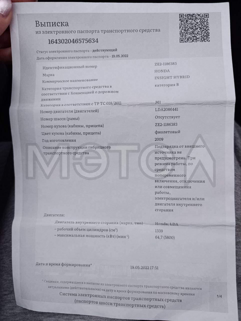 Легковой автомобиль HONDA INSIGHT HYBRID 2009 г.в. в залоге у АО «ТБанк» (гос.номер Р481РМ198)
