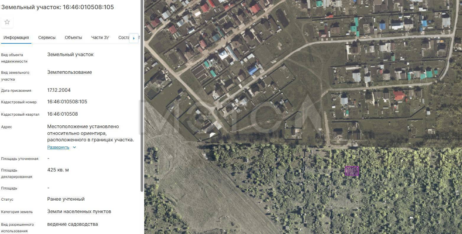 Земельный участок, площадь: 425кв.м, кадастровый номер: 16:46:010508:105, Категория земель: Земли населенных пунктов, Вид разрешенного использования: ведение садоводства, адрес (местонахождение): Татарстан Респ, Бугульминский р-н, Бугульма г, дом № 105