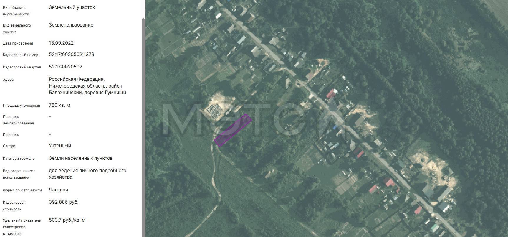 Земельный участок, площадь: 780кв.м., кадастровый номер: 52:17:0020502:1379, Категория земель: Земли населенных пунктов, Вид разрешенного использования: для ведения личного подсобного хозяйства, адрес (местонахождение): Российская Федерация, Нижегородская область, район Балахнинский, деревня Гумнищи